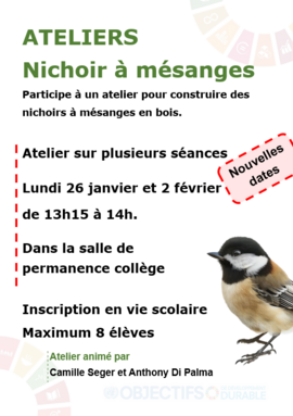 Par CAMILLE SEGER, publié le mercredi 7 janvier 2026 19:01 - Mis à jour le jeudi 15 janvier 2026 17:57Construction de nichoirs à mésanges lundis 26 janvier et 2 février à 13h15 en salle de permanence. Inscription à la vie scolaire, maximum 8 élèves. Ateliers animés par Mr Di Palma et Mme Seger. -